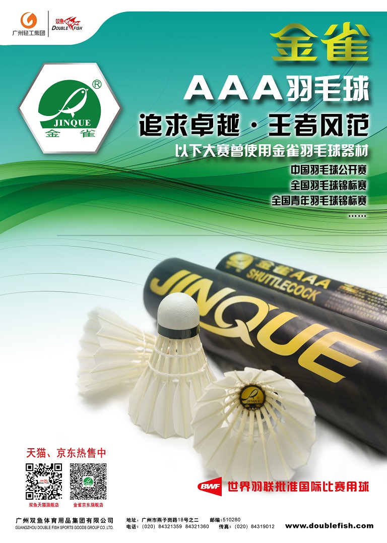 The Jinque badminton equipment produced by Double Fish Group boast a long history. The brand Jinque has won honors of “famous trademark of Guangdong” and “famous trademark of Guangzhou”. Jinque shuttlecock has been approved by Badminton World Federation as a ball for international games and has been designated as the ball for a lot of events such as Badminton Asia Championships, China Open (Badminton), China Badminton Championship, National Badminton Championship, National Youth Badminton Championship, Badminton Competition of City Games, Asian Youth Badminton Championship. In early 21st century, Jinque shuttlecock was also designated as the ball for daily training of national badminton team and national youth badminton team for a long period.